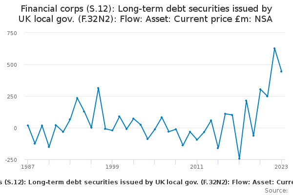 Download this time seriesFinancial corps (S.12): Long-term debt securities issued by UK local gov. (F.32N2): Flow: Asset: Current price £m: NSA