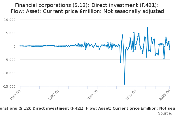 Download this time seriesFinancial corporations (S.12): Direct investment (F.421): Flow: Asset: Current price £million: Not seasonally adjusted
