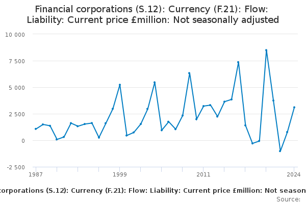 Download this time seriesFinancial corporations (S.12): Currency (F.21): Flow: Liability: Current price £million: Not seasonally adjusted