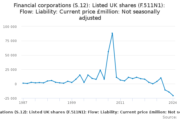 Download this time seriesFinancial corporations (S.12): Listed UK shares (F.511N1): Flow: Liability: Current price £million: Not seasonally adjusted