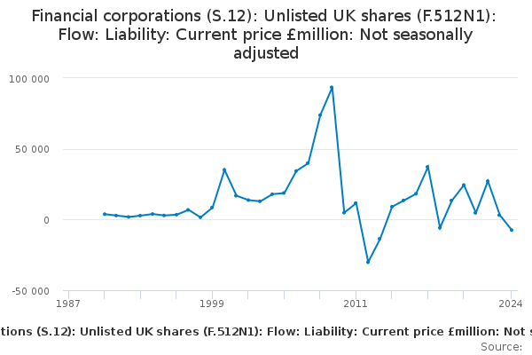 Download this time seriesFinancial corporations (S.12): Unlisted UK shares (F.512N1): Flow: Liability: Current price £million: Not seasonally adjusted