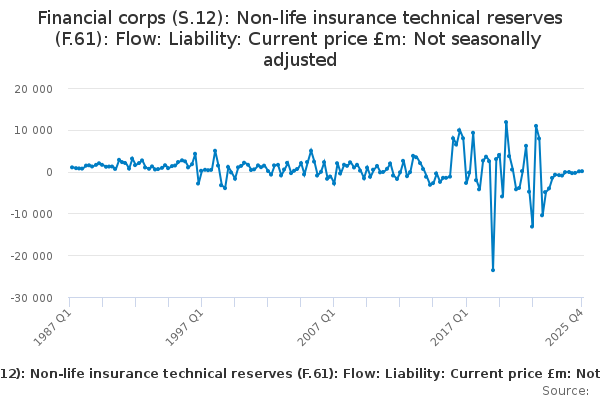 Download this time seriesFinancial corps (S.12): Non-life insurance technical reserves (F.61): Flow: Liability: Current price £m: Not seasonally adjusted