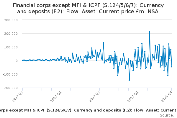 Download this time seriesFinancial corps except MFI & ICPF (S.124/5/6/7): Currency and deposits (F.2): Flow: Asset: Current price £m: NSA