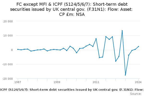 Download this time seriesFC except MFI & ICPF (S124/5/6/7): Short-term debt securities issued by UK central gov. (F.31N1): Flow: Asset: CP £m: NSA