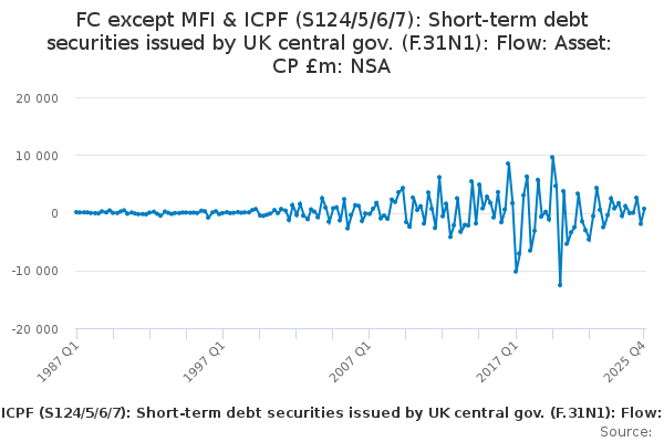 Download this time seriesFC except MFI & ICPF (S124/5/6/7): Short-term debt securities issued by UK central gov. (F.31N1): Flow: Asset: CP £m: NSA