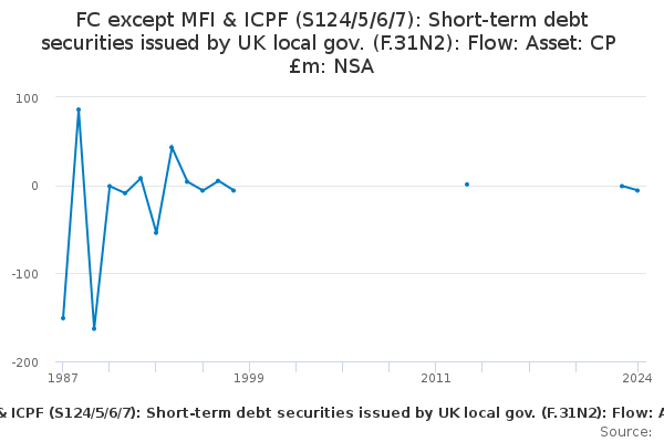 Download this time seriesFC except MFI & ICPF (S124/5/6/7): Short-term debt securities issued by UK local gov. (F.31N2): Flow: Asset: CP £m: NSA