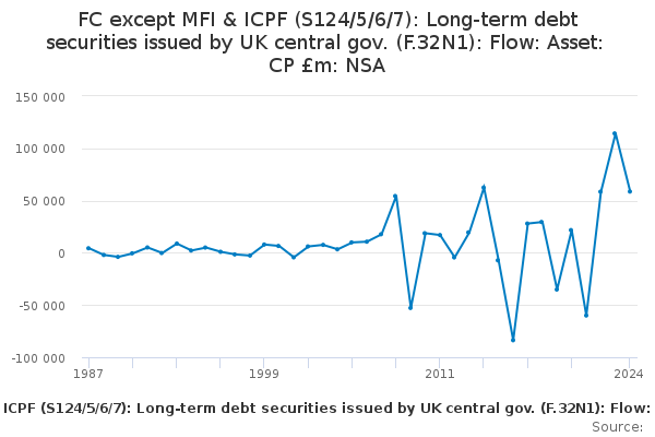 Download this time seriesFC except MFI & ICPF (S124/5/6/7): Long-term debt securities issued by UK central gov. (F.32N1): Flow: Asset: CP £m: NSA