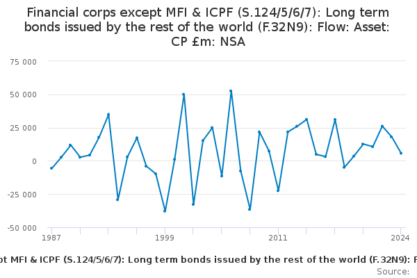 Download this time seriesFinancial corps except MFI & ICPF (S.124/5/6/7): Long term bonds issued by the rest of the world (F.32N9): Flow: Asset: CP £m: NSA