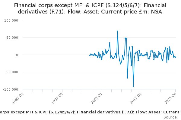 Download this time seriesFinancial corps except MFI & ICPF (S.124/5/6/7): Financial derivatives (F.71): Flow: Asset: Current price £m: NSA
