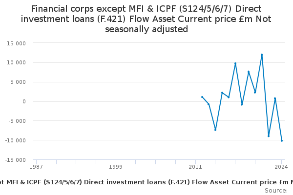 Download this time seriesFinancial corps except MFI & ICPF (S124/5/6/7) Direct investment loans (F.421) Flow Asset Current price £m Not seasonally adjusted