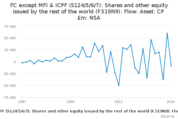 Download this time seriesFC except MFI & ICPF (S124/5/6/7): Shares and other equity issued by the rest of the world (F.519N9): Flow: Asset: CP £m: NSA
