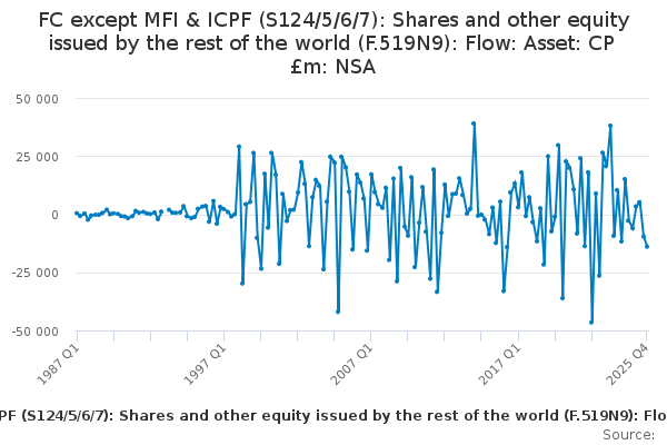 Download this time seriesFC except MFI & ICPF (S124/5/6/7): Shares and other equity issued by the rest of the world (F.519N9): Flow: Asset: CP £m: NSA