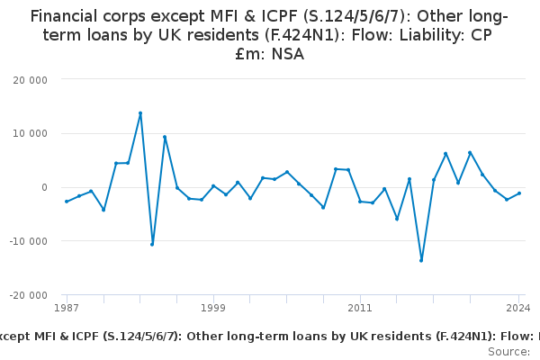 Download this time seriesFinancial corps except MFI & ICPF (S.124/5/6/7): Other long-term loans by UK residents (F.424N1): Flow: Liability: CP £m: NSA