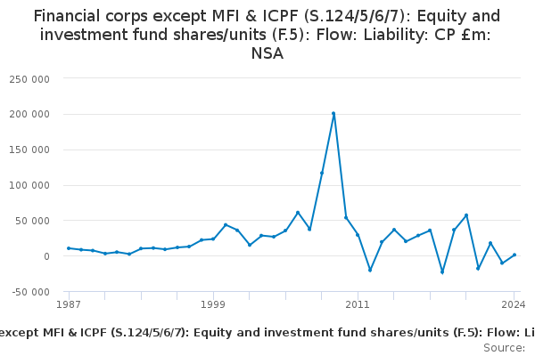 Download this time seriesFinancial corps except MFI & ICPF (S.124/5/6/7): Equity and investment fund shares/units (F.5): Flow: Liability: CP £m: NSA