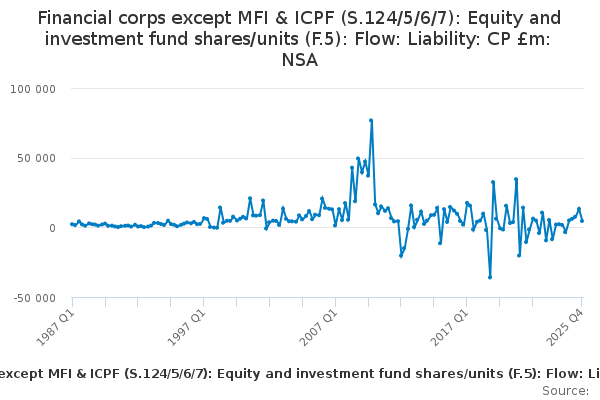 Download this time seriesFinancial corps except MFI & ICPF (S.124/5/6/7): Equity and investment fund shares/units (F.5): Flow: Liability: CP £m: NSA