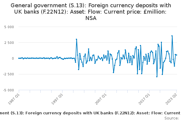 Download this time seriesGeneral government (S.13): Foreign currency deposits with UK banks (F.22N12): Asset: Flow: Current price: £million: NSA