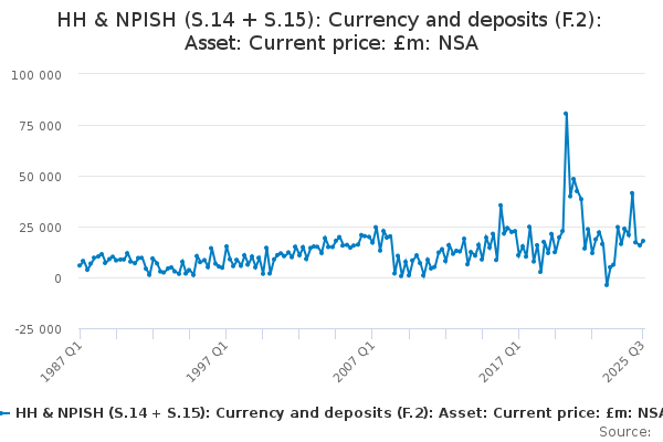 Download this time seriesHH & NPISH (S.14 + S.15): Currency and deposits (F.2): Asset: Current price: £m: NSA