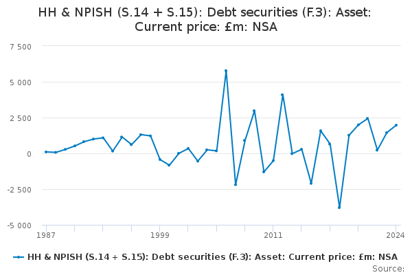 Download this time seriesHH & NPISH (S.14 + S.15): Debt securities (F.3): Asset: Current price: £m: NSA