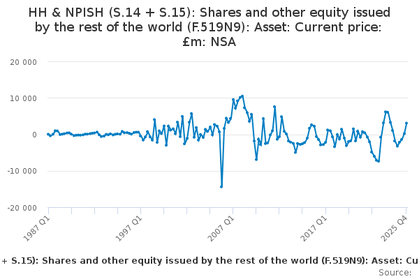 Download this time seriesHH & NPISH (S.14 + S.15): Shares and other equity issued by the rest of the world (F.519N9): Asset: Current price: £m: NSA