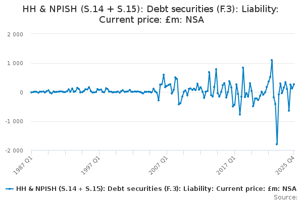 Download this time seriesHH & NPISH (S.14 + S.15): Debt securities (F.3): Liability: Current price: £m: NSA