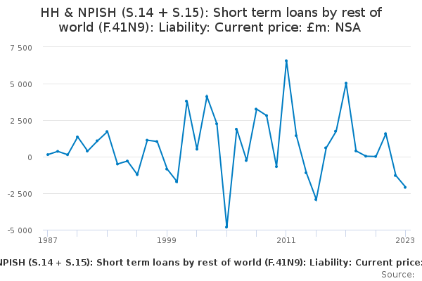 Download this time seriesHH & NPISH (S.14 + S.15): Short term loans by rest of world (F.41N9): Liability: Current price: £m: NSA
