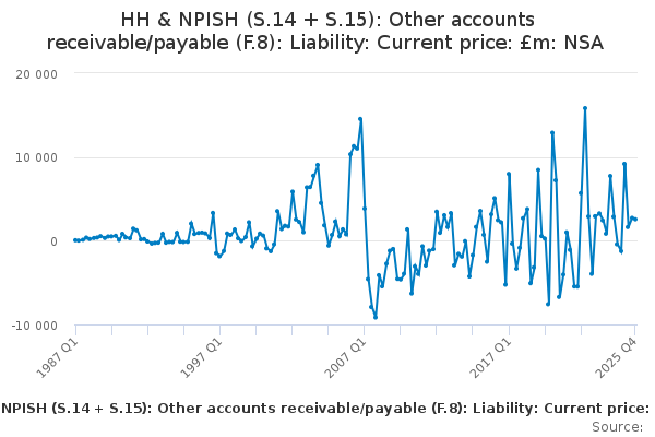 Download this time seriesHH & NPISH (S.14 + S.15): Other accounts receivable/payable (F.8): Liability: Current price: £m: NSA