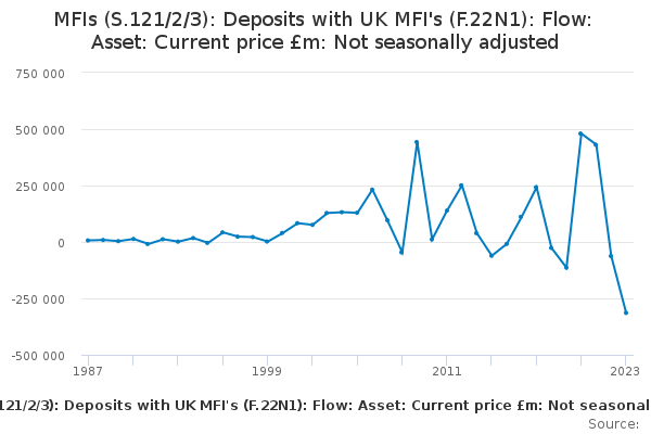 Download this time seriesMFIs (S.121/2/3): Deposits with UK MFI's (F.22N1): Flow: Asset: Current price £m: Not seasonally adjusted