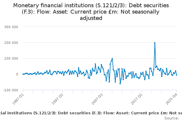 Download this time seriesMonetary financial institutions (S.121/2/3): Debt securities (F.3): Flow: Asset: Current price £m: Not seasonally adjusted
