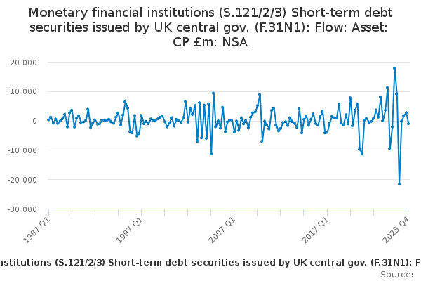 Download this time seriesMonetary financial institutions (S.121/2/3) Short-term debt securities issued by UK central gov. (F.31N1): Flow: Asset: CP £m: NSA