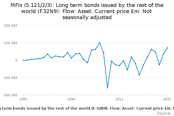 Download this time seriesMFIs (S.121/2/3): Long term bonds issued by the rest of the world (F.32N9): Flow: Asset: Current price £m: Not seasonally adjusted