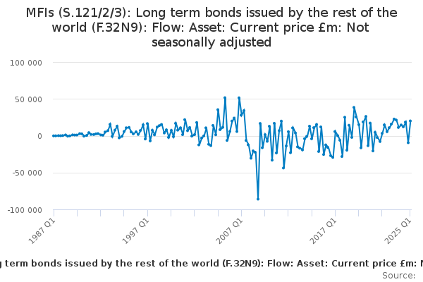 Download this time seriesMFIs (S.121/2/3): Long term bonds issued by the rest of the world (F.32N9): Flow: Asset: Current price £m: Not seasonally adjusted
