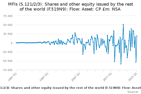 Download this time seriesMFIs (S.121/2/3): Shares and other equity issued by the rest of the world (F.519N9): Flow: Asset: CP £m: NSA