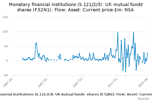 Download this time seriesMonetary financial institutions (S.121/2/3): UK mutual funds' shares (F.52N1): Flow: Asset: Current price £m: NSA
