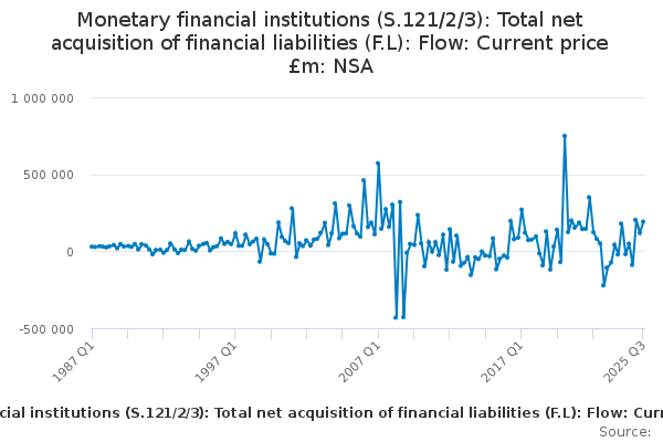Download this time seriesMonetary financial institutions (S.121/2/3): Total net acquisition of financial liabilities (F.L): Flow: Current price £m: NSA