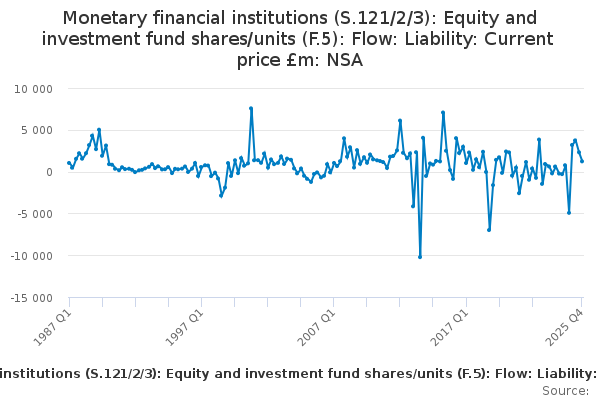 Download this time seriesMonetary financial institutions (S.121/2/3): Equity and investment fund shares/units (F.5): Flow: Liability: Current price £m: NSA