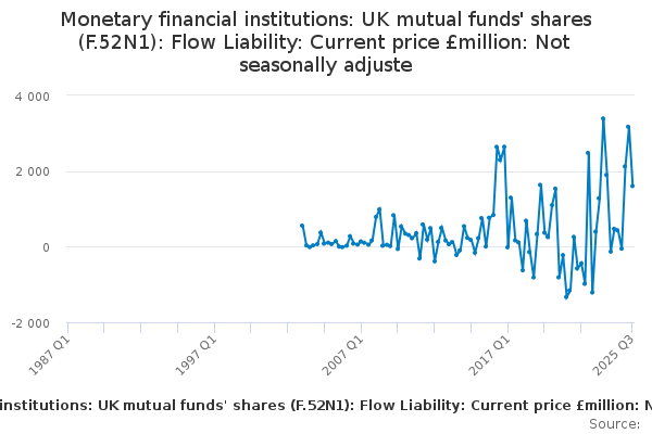 Download this time seriesMonetary financial institutions: UK mutual funds' shares (F.52N1): Flow Liability: Current price £million: Not seasonally adjuste