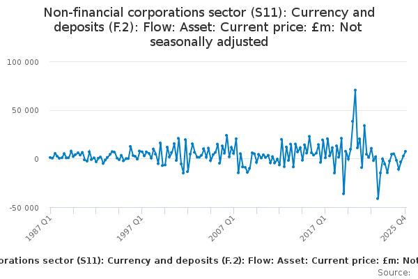 Download this time seriesNon-financial corporations sector (S11): Currency and deposits (F.2): Flow: Asset: Current price: £m: Not seasonally adjusted