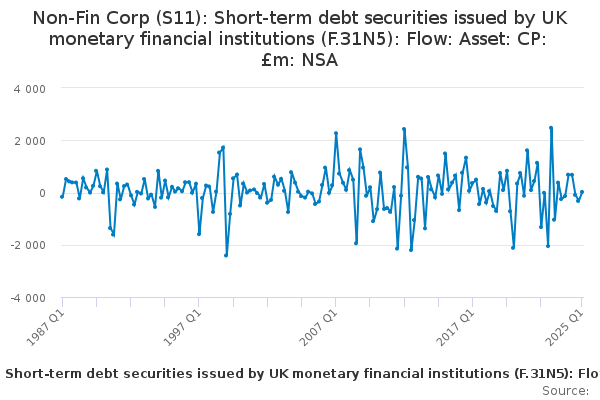 Download this time seriesNon-Fin Corp (S11): Short-term debt securities issued by UK monetary financial institutions (F.31N5): Flow: Asset: CP: £m: NSA