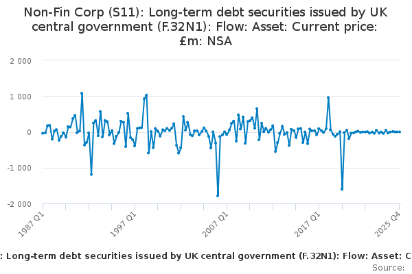 Download this time seriesNon-Fin Corp (S11): Long-term debt securities issued by UK central government (F.32N1): Flow: Asset: Current price: £m: NSA