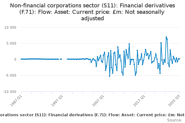 Download this time seriesNon-financial corporations sector (S11): Financial derivatives (F.71): Flow: Asset: Current price: £m: Not seasonally adjusted