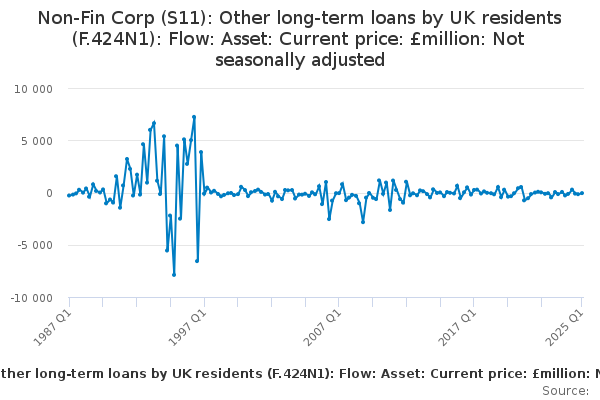 Download this time seriesNon-Fin Corp (S11): Other long-term loans by UK residents (F.424N1): Flow: Asset: Current price: £million: Not seasonally adjusted