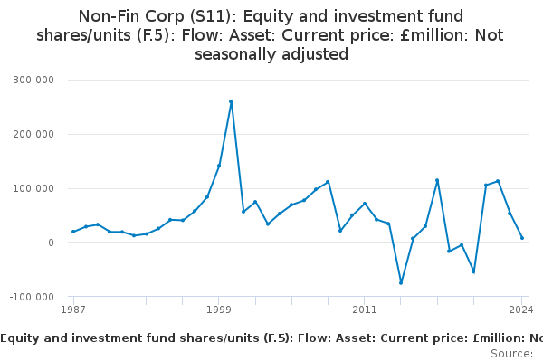 Download this time seriesNon-Fin Corp (S11): Equity and investment fund shares/units (F.5): Flow: Asset: Current price: £million: Not seasonally adjusted