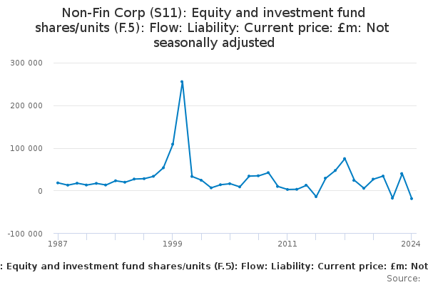 Download this time seriesNon-Fin Corp (S11): Equity and investment fund shares/units (F.5): Flow: Liability: Current price: £m: Not seasonally adjusted