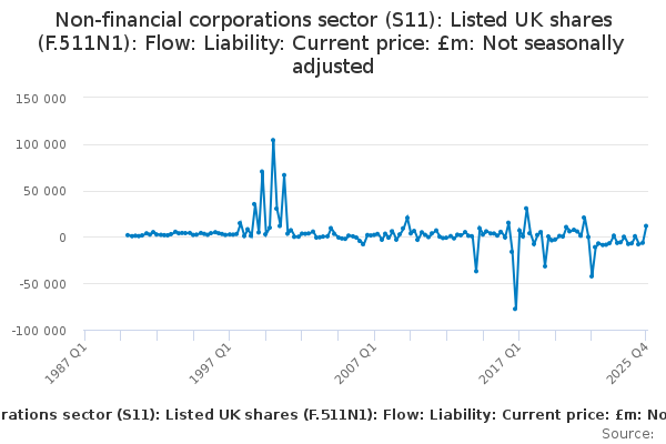 Download this time seriesNon-financial corporations sector (S11): Listed UK shares (F.511N1): Flow: Liability: Current price: £m: Not seasonally adjusted