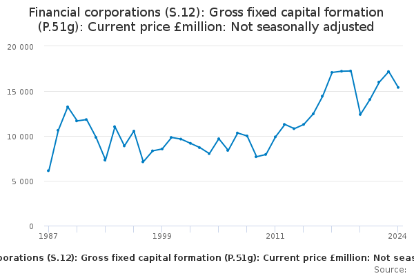 Download this time seriesFinancial corporations (S.12): Gross fixed capital formation (P.51g): Current price £million: Not seasonally adjusted