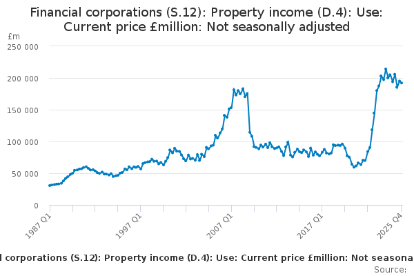Download this time seriesFinancial corporations (S.12): Property income (D.4): Use: Current price £million: Not seasonally adjusted