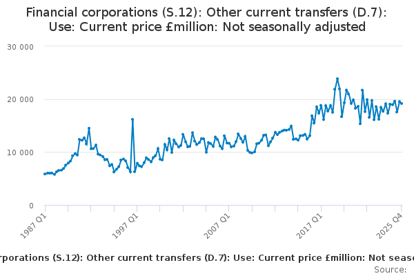 Download this time seriesFinancial corporations (S.12): Other current transfers (D.7): Use: Current price £million: Not seasonally adjusted