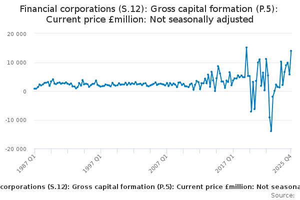 Download this time seriesFinancial corporations (S.12): Gross capital formation (P.5): Current price £million: Not seasonally adjusted