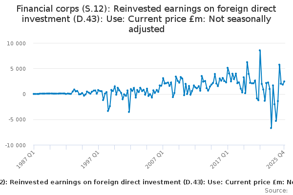 Download this time seriesFinancial corps (S.12): Reinvested earnings on foreign direct investment (D.43): Use: Current price £m: Not seasonally adjusted