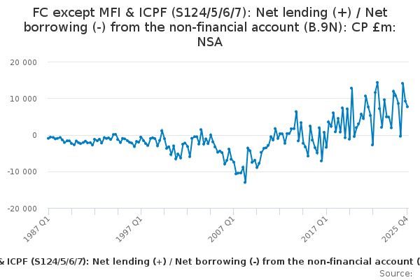 Download this time seriesFC except MFI & ICPF (S124/5/6/7): Net lending (+) / Net borrowing (-) from the non-financial account (B.9N): CP £m: NSA